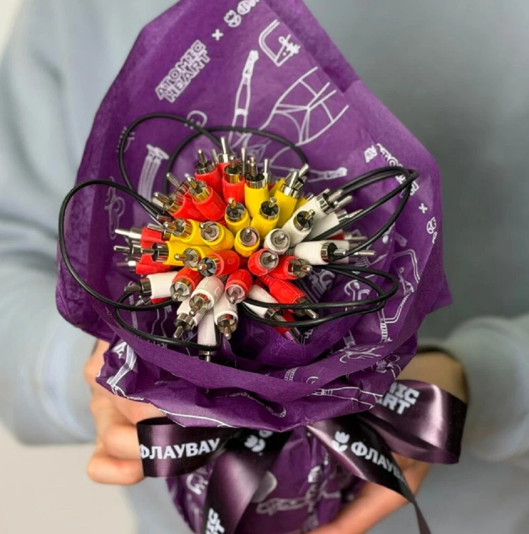 И «цветы» действительно оказались близки к роботизированной тематике. Букеты из коллекции Atomic Heart состоят из кабелей-«тюльпанов» или включают в себя металлические розы. Помимо букетов с изображением игровых элементов, цветы получится подарить в оцинкованном ведёрке.