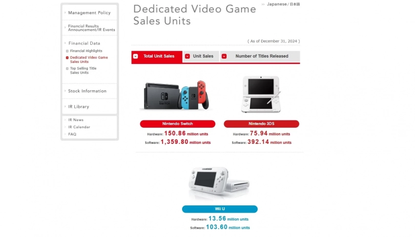 Согласно ему, общий тираж консолей Nintendo Switch составил 150,86 млн - по состоянию на 31 декабря 2024 года. Таким образом за 3 месяца (октябрь, ноябрь, декабрь) было продано ещё 4,82 млн устройств.