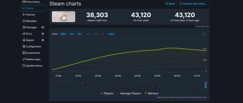 Тем временем местный пиковый онлайн Civilization 7 превысил 43 тыс игроков одновременно.