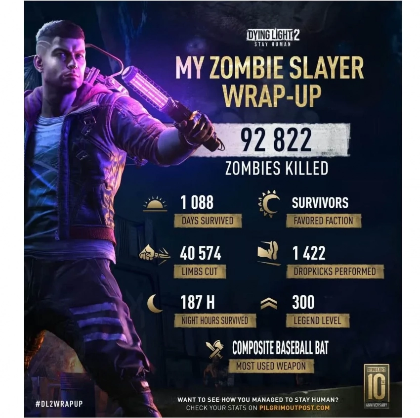 Самое интересное о кино на YouTube канале Игромании!Арт Dying Light 2Десятилетие серии Dying Light продолжают праздновать создатели зомби-боевика и множество поклонников. И для игроков разработчики приготовили очередной подарок: статистику профиля, которую можно получить по запросу в виде инфографики.