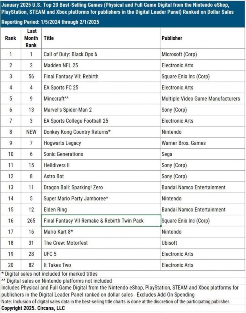 Самой востребованной игрой января стала Call of Duty: Black Ops 6. На платформах PlayStation шутер возглавил рейтинг, а на Xbox занял второе место. Примечателен рост популярности Final Fantasy VII Rebirth, которая поднялась с 56-го на третье место благодаря релизу на ПК.