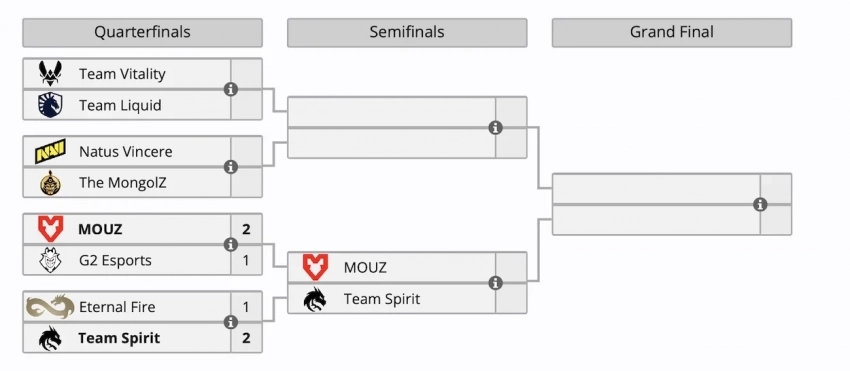MOUZ одолела G2 Esports, а Eternal Fire уступила Team Spirit. Оба поединка завершились со счетом 2:1. Победители прошли в полуфинал. А G2 и Eternal Fire разделили 5-8 места, заработав по 18 тыс долларов.