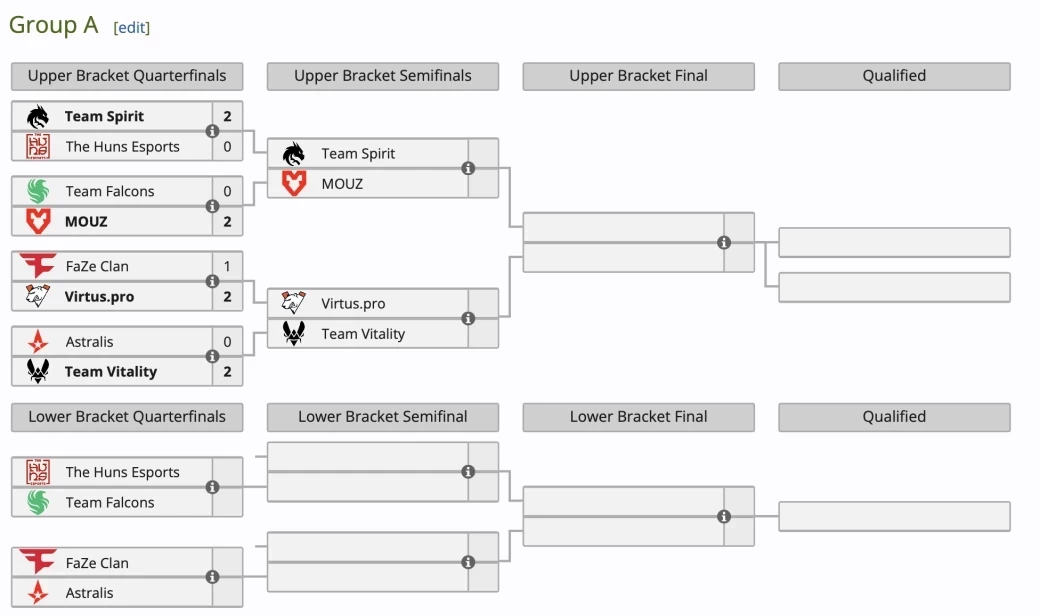 21 марта пройдут четыре поединка группы А. Team Spirit с MOUZ и Virtus.pro с Team Vitality определят финалистов сетки и участников плей-офф. А The Huns Esports с Team Falcons и FaZe Clan с Astralis сразятся за выживание в нижней сетке.