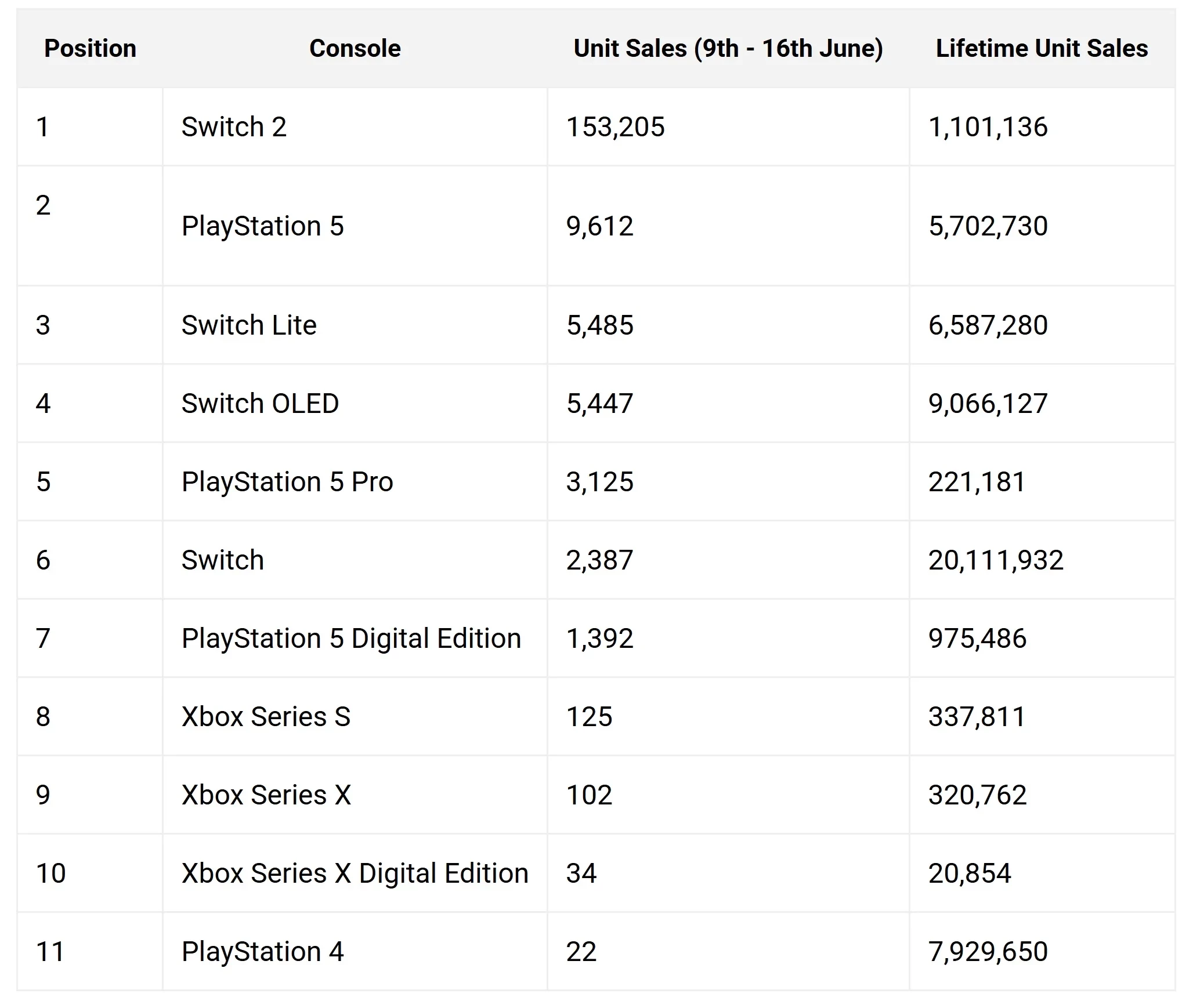 По недельным продажам Nintendo Switch 2 опережает вообще всех конкурентов. Однако по суммарным продажам пока ещё не обгоняет PlayStation 5, PlayStation 4, а также первый Switch, Switch Lite и Switch Oled.
