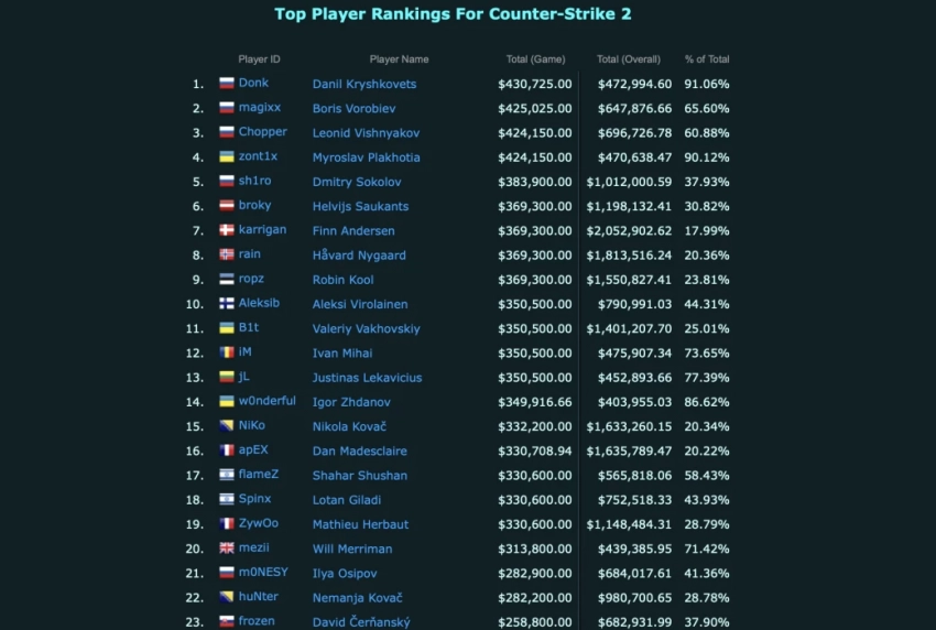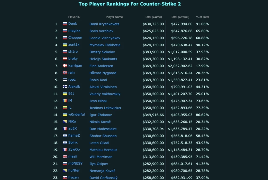 Главные новости » Эксклюзив » Team Spirit и ее игроки возглавили рейтинги по количеству призовых в Counter-Strike 2