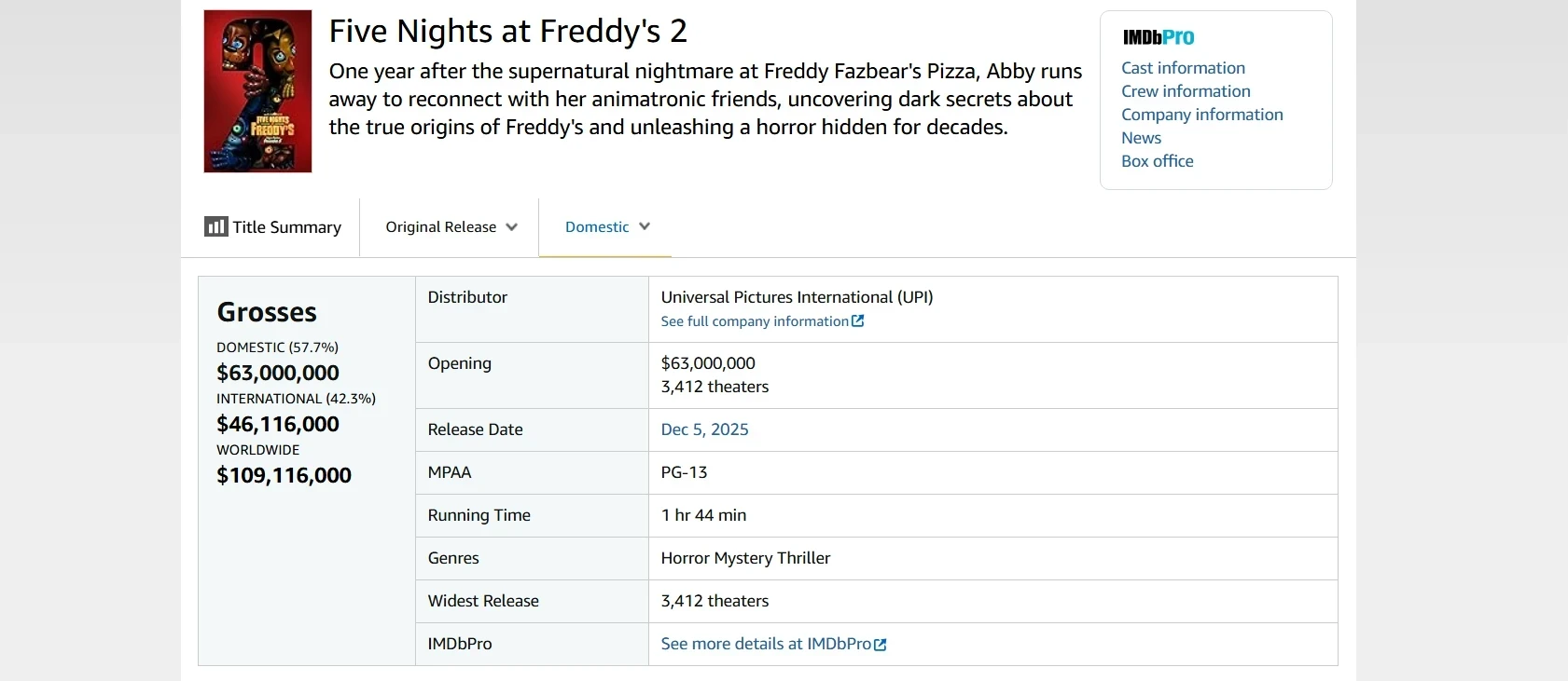 При этом до первой части сиквел не дотянул. Оригинальный «Пять ночей с Фредди» в своё время стартовал со 130 млн долларов в мире и 78 млн долларов в США. Его бюджет составил 20 млн долларов.