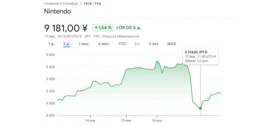 Самое интересное о кино на YouTube канале Игромании!Анонс Nintendo Switch 2Вчера состоялся долгожданный анонс новой консоли Nintendo. Однако новинка не вызвала бурных восторгов у игроков и экспертов. Результат не замедлил сказаться: акции компании сразу же упали на 7,2%. Вскоре они, впрочем, начали вновь дорожать, но пока что до прежнего уровня не поднялись: разница по сравнению с 16 января составляет 4,3%.