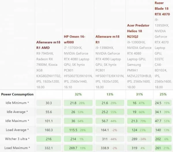 В режиме простоя Alienware m18 на базе AMD система потребляет минимум 30 Вт, что весьма много. Самой же большой проблемой указанного лэптопа в плане энергопотребления является режим ожидания (спящий режим), при котором система потребляет целых 25,6 Вт, когда типичный показатель здесь должен быть 1 или 2 Вт. По этой причине обозреватель назвал Alienware m18 на базе AMD «десктопной системой с аварийным аккумулятором», а не привычным ноутбуком. Однако даже настольные ПК не потребляют столько энергии в спящем режиме.