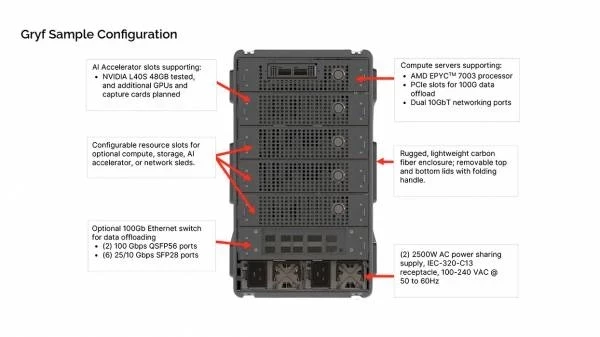 Каждый Gryf содержит несколько слотов, заполненных модулями для вычисления, хранения, ускорения и сетевыми платами, адаптированными к рабочей нагрузке. Суперкомпьютер размером с чемодан имеет шесть слотов для модулей, которые можно вставлять и извлекать по мере необходимости.