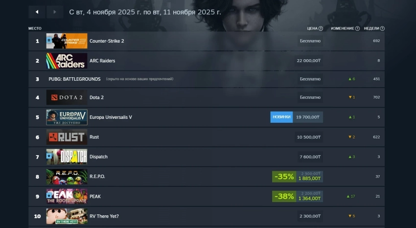 Если сфокусироваться на российском сегменте Steam, то первые два места остались неизменными в сравнении с прошлой неделей: на первом и втором месте расположились Counter-Strike 2 и ARC Raiders. На третью строчку вернулась королевская битва PUBG: Battlegrounds, поднявшаяся на шесть позиций.
