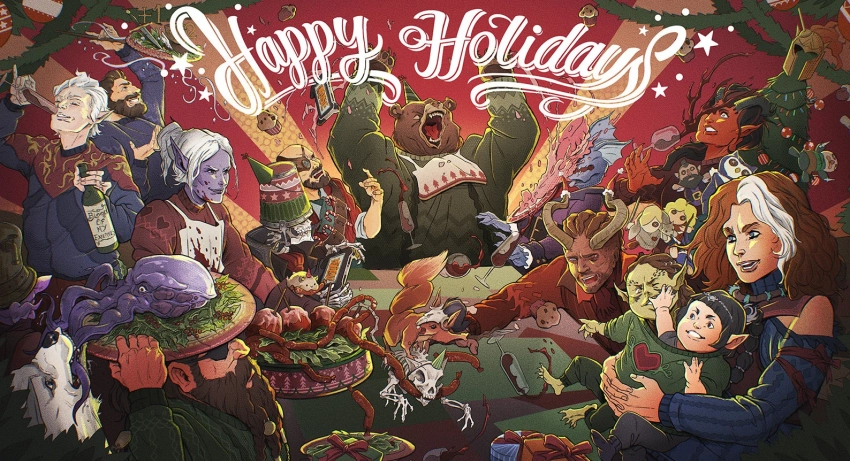 Заодно разработчики Baldur’s Gate 3 пожелали игрокам счастливых праздников. В честь этого была показана открытка, на которой ключевые персонажи ролевой игры устроили грандиозный пир.