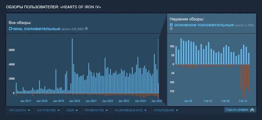 Китайское сообщество высказало своё недовольство на форуме Steam, но этого показалось мало. Игроки прибегли к традиционной методике отрицательных отзывов: в первую очередь, разумеется, пострадала Hearts of Iron 4, но досталось и Stellaris, Crusader Kings III, Europa Universalis IV, Victoria 3 и другим играм Paradox.