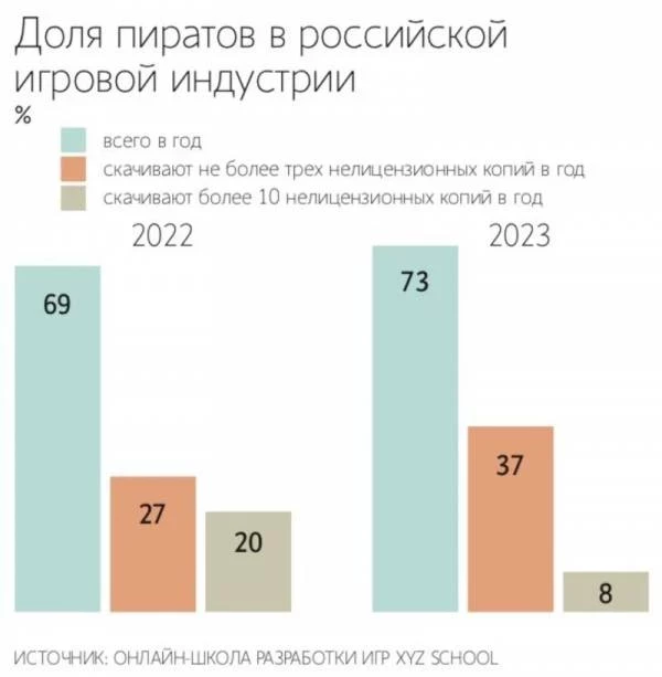 Геймеры из России за 2023 год скачали пиратские копии игр на общую сумму более чем 324 млрд руб. Хотя бы один раз такую копию запускали на своих компьютерах 73 % российских любителей игр — годом ранее этот показатель был 69 %. Более 10 пиратских игр установили 8 % геймеров. Самыми популярными наименованиями стали Atomic Heart, Hogwarts Legacy и Baldur’s Gate 3, которые приглянулись 84 % пиратам, пишут «Ведомости» со ссылкой на данные XYZ School.